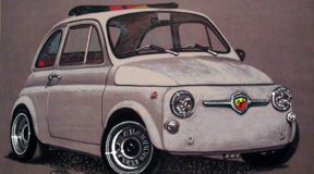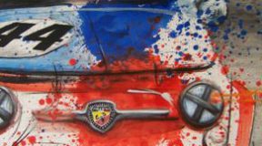 Abarth OT 1300: “L’auto nel suo dinamismo,sembra coinvolgere il suo trionfante creatore…” (Tempera su cartoncino – 50 x 50 cm)